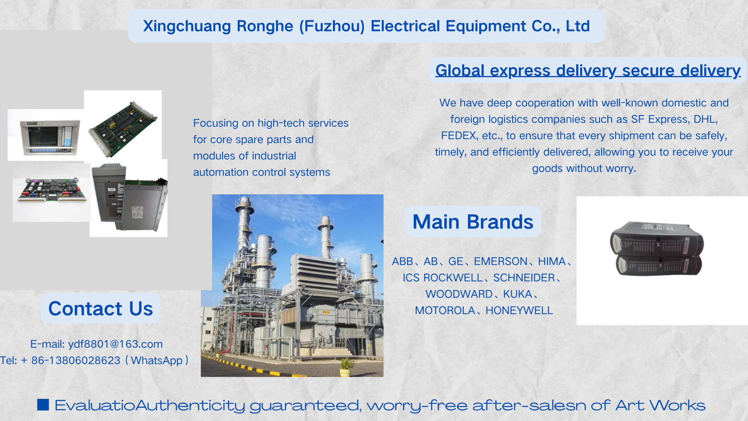 ABB、EPRO、GE、FOXBORO、Schneider、Rexroth、Honeywell、Bently、YASKAWA other global DCS system and PLC system, servo system of famous industrial brand.